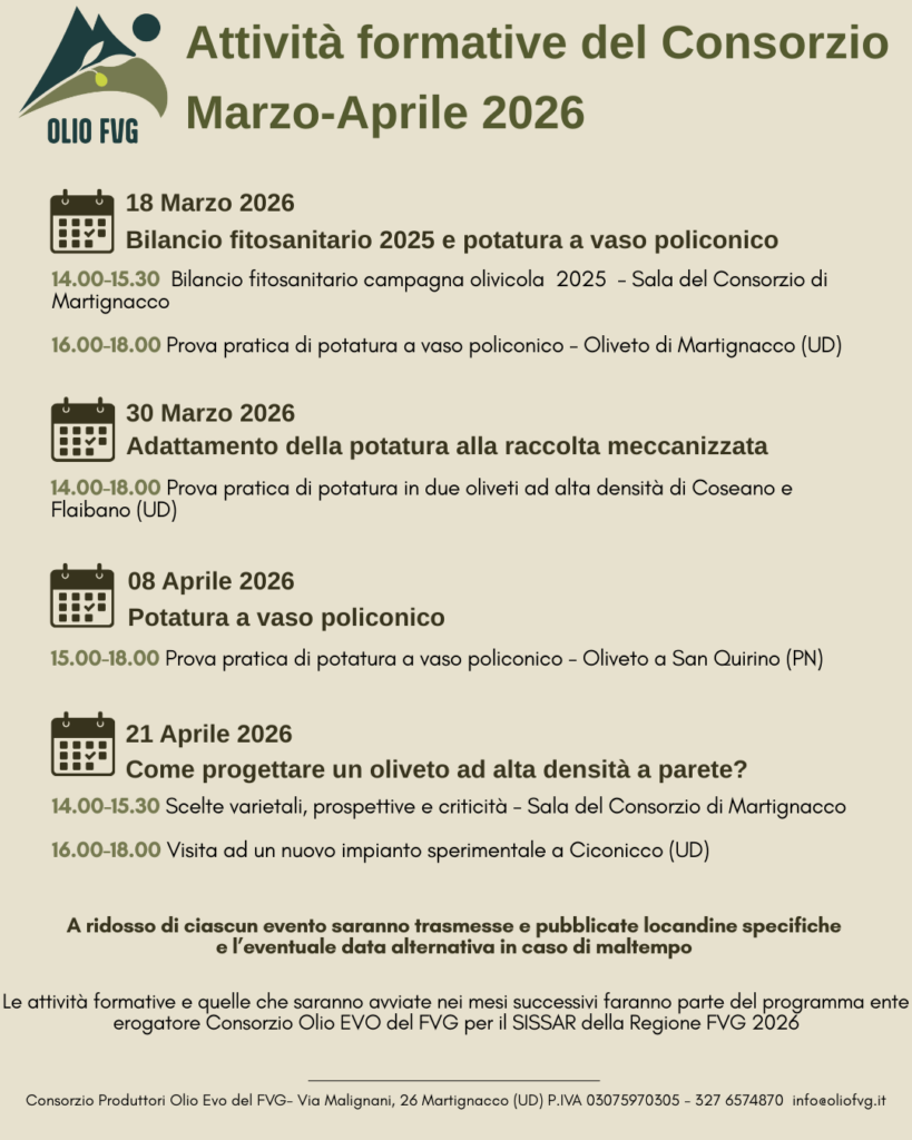 • Ad alta densità: due approfondimenti (il 30 marzo tra Coseano e Flaibano e il 21 aprile a Martignacco) focalizzati sulle tecniche di adattamento della potatura alla raccolta meccanizzata e alla progettazione di un nuovo oliveto a più alta densità
