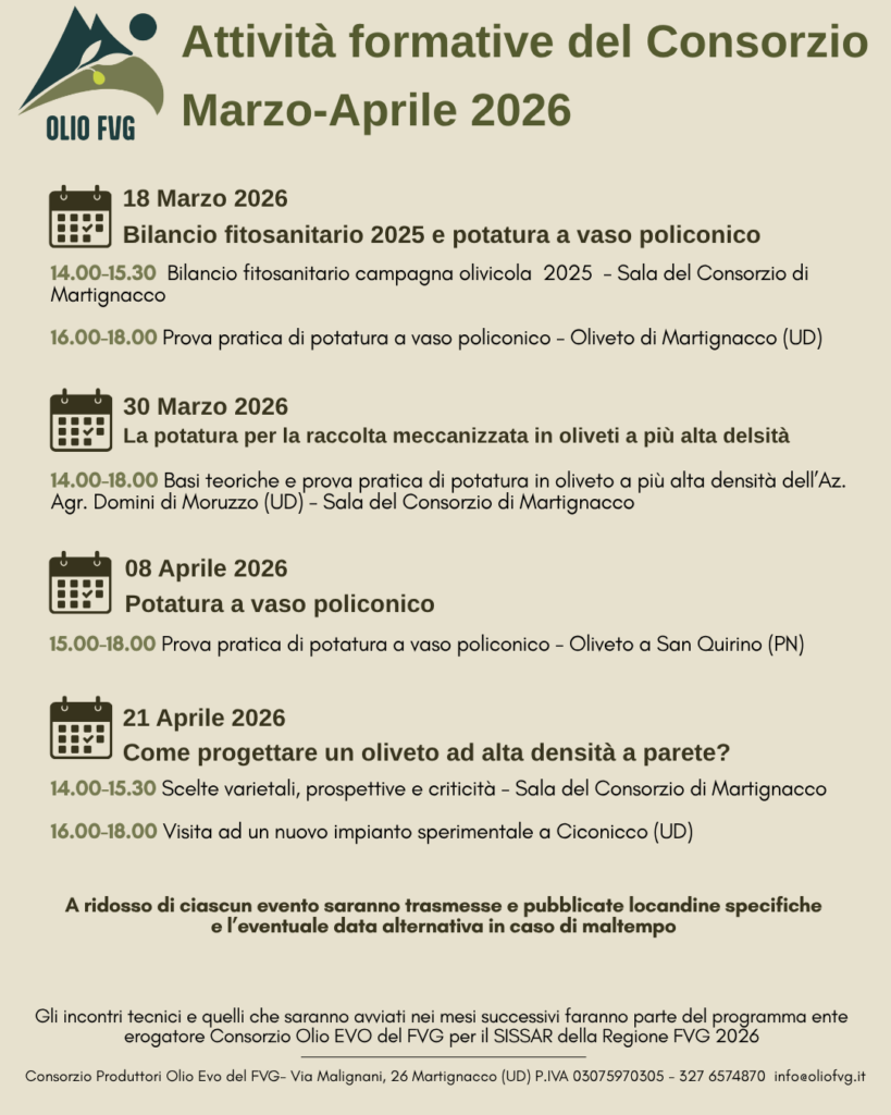 Il Consorzio Olio FVG inaugura la stagione formativa con un ciclo di quattro incontri tecnici relativi alla potatura dell’olivo. Il programma è pensato per offrire agli olivicoltori un supporto teorico e pratico, avvalendosi dell’esperienza di relatori esperti del settore.